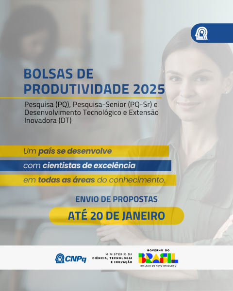 O Conselho Nacional de Desenvolvimento Científico e Tecnológico (CNPq) inscreve até 20 de janeiro de 2026 para as bolsas de Produtividade em Pesquisa (PQ), Produtividade em Pesquisa Sênior (PQ-Sr) e Desenvolvimento Tecnológico e Extensão Inovadora (DT).
