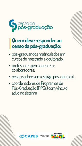 Para realizar o Censo da Pós-Graduação stricto sensu da CAPES, deve ser preenchido um formulário eletrônico no link a seguir: https://sucupira.capes.gov.br/. Para saber como responder ao questionário, veja o tutorial no link a seguir: https://youtu.be/QNSxIy_IbKc?si=wwJwnjsEIHus-Mrx
