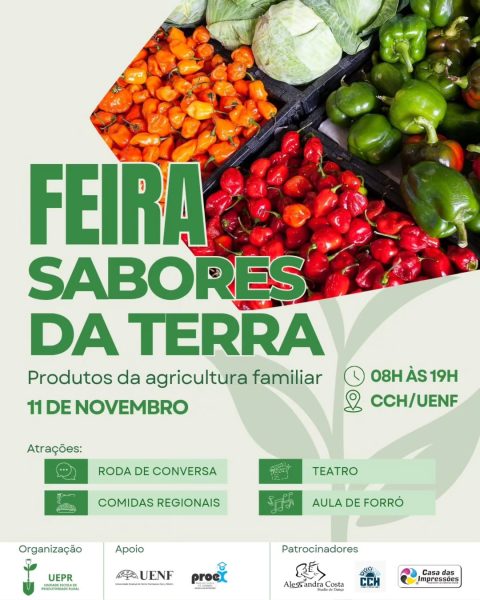 A Unidade Escola de Produtividade Rural (UEPR), com apoio da Pró-Reitoria de Extensão (ProEX) da UENF, realiza na próxima terça-feira, 11/11/25, das 8 às 19 horas, no Centro de Ciências do Homem (CCH) da UENF, a Feira Sabores da Terra com produtos da agricultura familiar. Na programação, roda de conversa, teatro, aula de forró e comidas regionais, entre outras atrações. Mais informações no link a seguir: https://www.instagram.com/projetoagricola_uenf/
