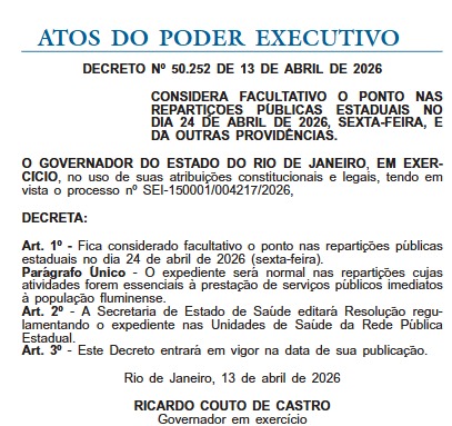 De acordo com o Decreto Nº 50.252, de 13 de abril de 2026, será considerado facultativo o ponto nas repartições públicas estaduais no dia 24 de abril de 2026, sexta-feira.