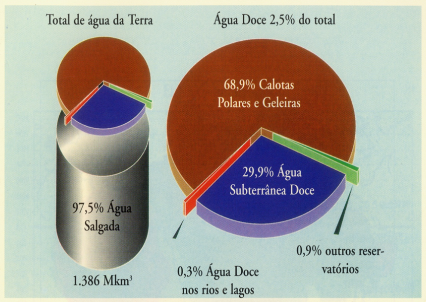 Embora ¾ do planeta Terra sejam cobertos por água, a maior parte dela está nos oceanos — portanto, a maior parte da água do planeta é salgada e não apropriada ao consumo. A água doce existente no planeta corresponde a apenas 2,5% de toda a água do planeta. E, deste percentual, a maior parte da água doce líquida se encontra no subterrâneo. São os chamados aquíferos.