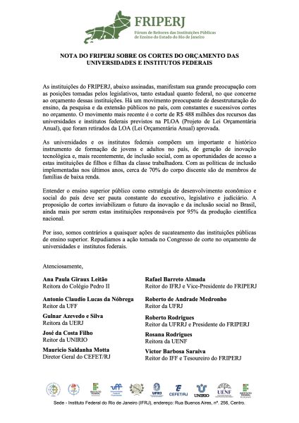 Nota do FRIPERJ sobre os cortes do orçamento das Universidades e Institutos Federais Leia AQUI Leia também:Aniversário da UENF: 1º Friperj Itinerante no Centro…Instituições se