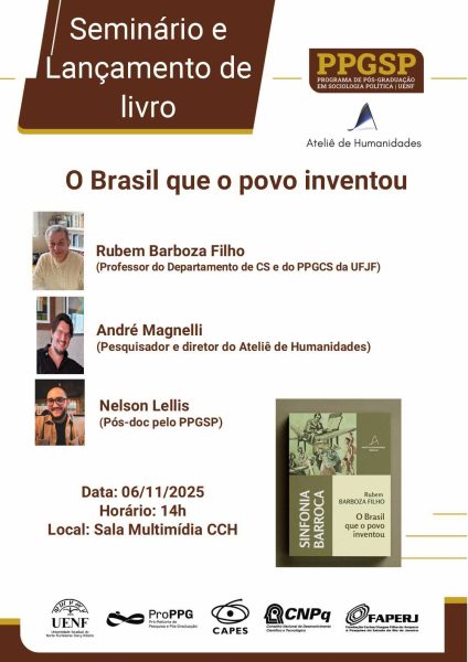 O Programa de Pós-Graduação em Sociologia Política (PPGSP) da Universidade Estadual do Norte Fluminense Darcy Ribeiro (UENF) e o Ateliê de Humanidades realizam nesta quinta-feira, 06/11/25, às 14 horas, na Sala Multimídia do Centro de Ciências do Homem (CCH), o Seminário “O Brasil que o povo inventou”.