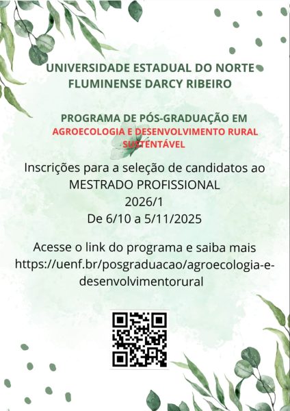 Terminam em 05/11/25 as inscrições para a primeira turma do Mestrado Profissional em Agroecologia e Desenvolvimento Rural Sustentável, referentes ao 1º semestre de 2026. Credenciado pela Capes em 10/06/25, o Mestrado oferece quatro Linhas de Pesquisa: Fundamentos da Agroecologia; Manejo Agroecológico do Solo; Saúde dos Sistemas Agroecológicos; e Sociedade, Desenvolvimento do Campo e Segurança Alimentar.