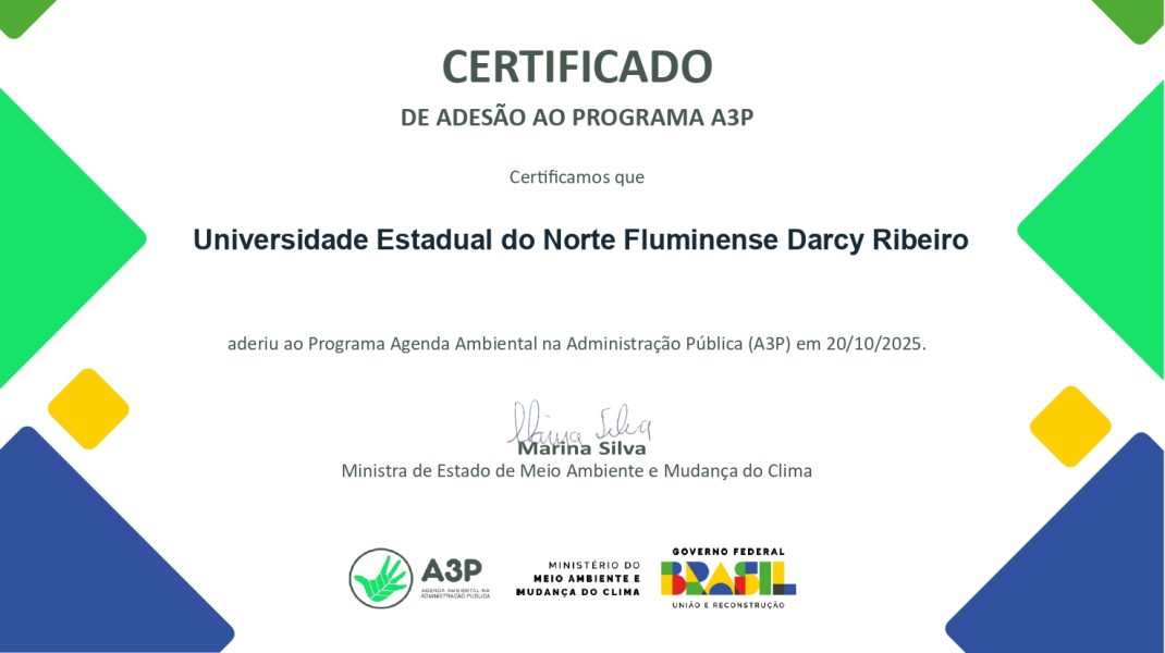 A obtenção do certificado de adesão constitui a confirmação oficial do MMA de que a UENF se comprometeu a desenvolver e executar um plano de trabalho específico, em conformidade com as diretrizes da A3P.