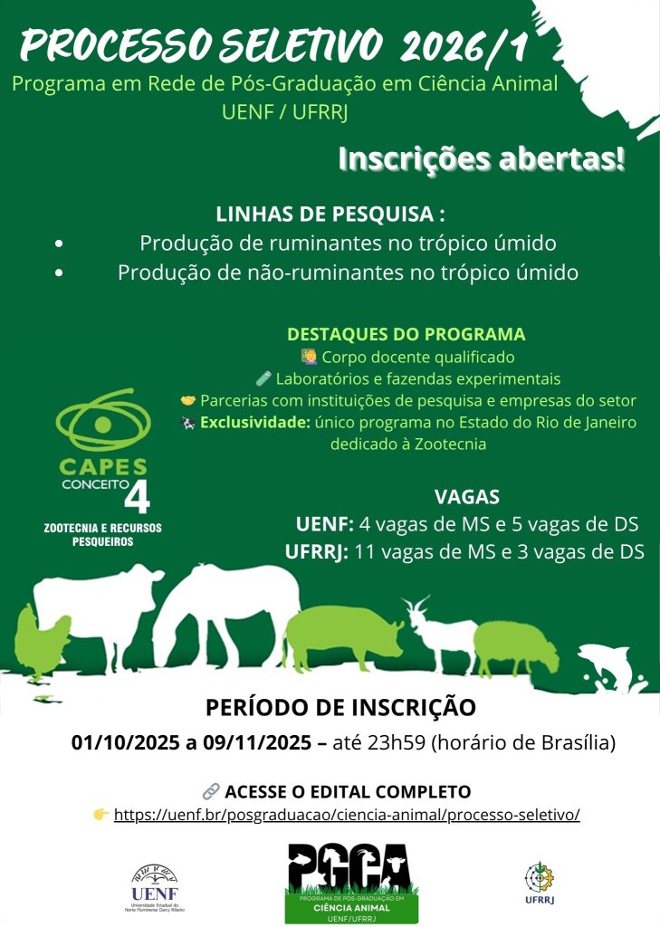 Ei, você que sonha em impulsionar sua carreira na área de Ciência Animal com uma formação de excelência no Brasil? O Programa de Pós-Graduação em Ciência Animal (PPGCA) da UENF/UFRRJ está com vagas abertas no Edital Nº 12/2025 do PEC-PG da CAPES! Essa é a sua chance de se juntar a uma comunidade vibrante, contribuindo para inovações técnicas e científicas, fortalecendo a educação e impulsionando o desenvolvimento socioeconômico regional e nacional.