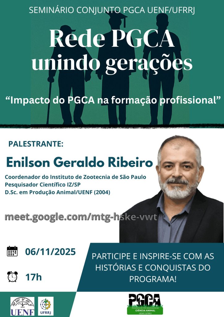 Faltam poucos dias para o seminário da Rede PGCA: Unindo Gerações! Participe e inspire-se com o Dr. Enilson Geraldo Ribeiro, egresso de mestrado e doutorado em Produção Animal/UENF, hoje Coordenador do Instituto de Zootecnia de São Paulo (IZ/SP).