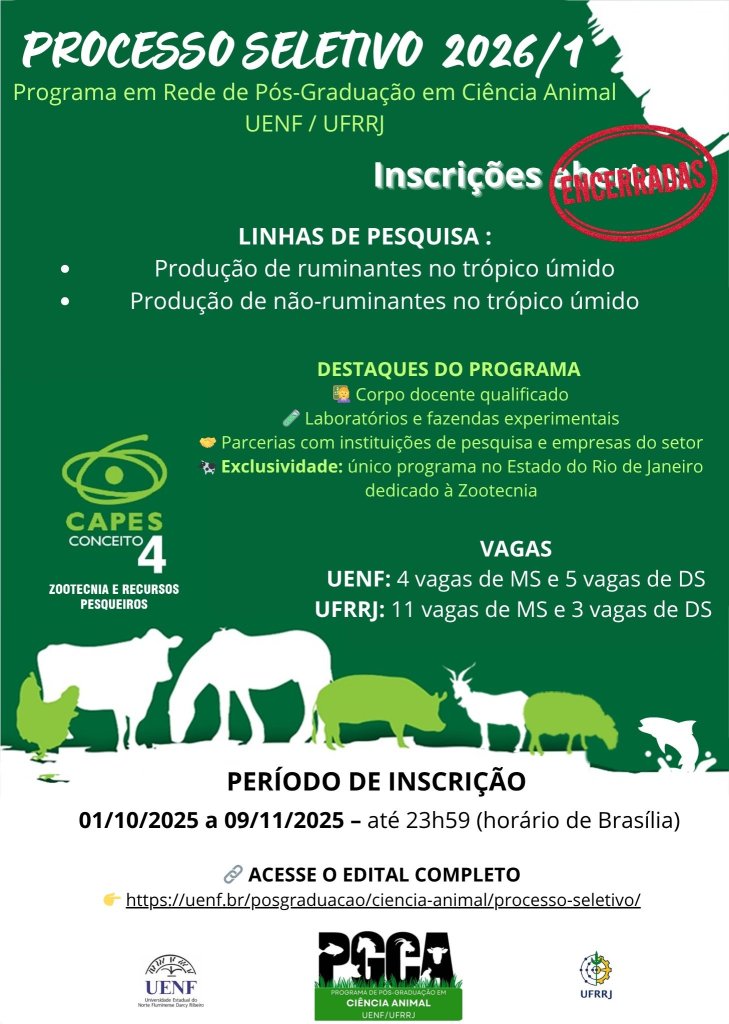 Inscreva-se no Edital de Seleção 2026/1 do Programa em Rede de Pós-Graduação em Ciência Animal da UENF/UFRRJ!