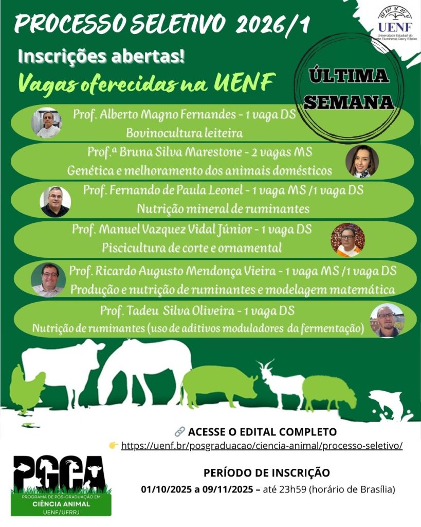 - Prof. Tadeu S. Oliveira: 1 vaga para Mestrado (Português ou Espanhol) – Foco em nutrição de ruminantes, perfeito para quem busca abordagens práticas e acessíveis. Contato: tsoliveira@uenf.br