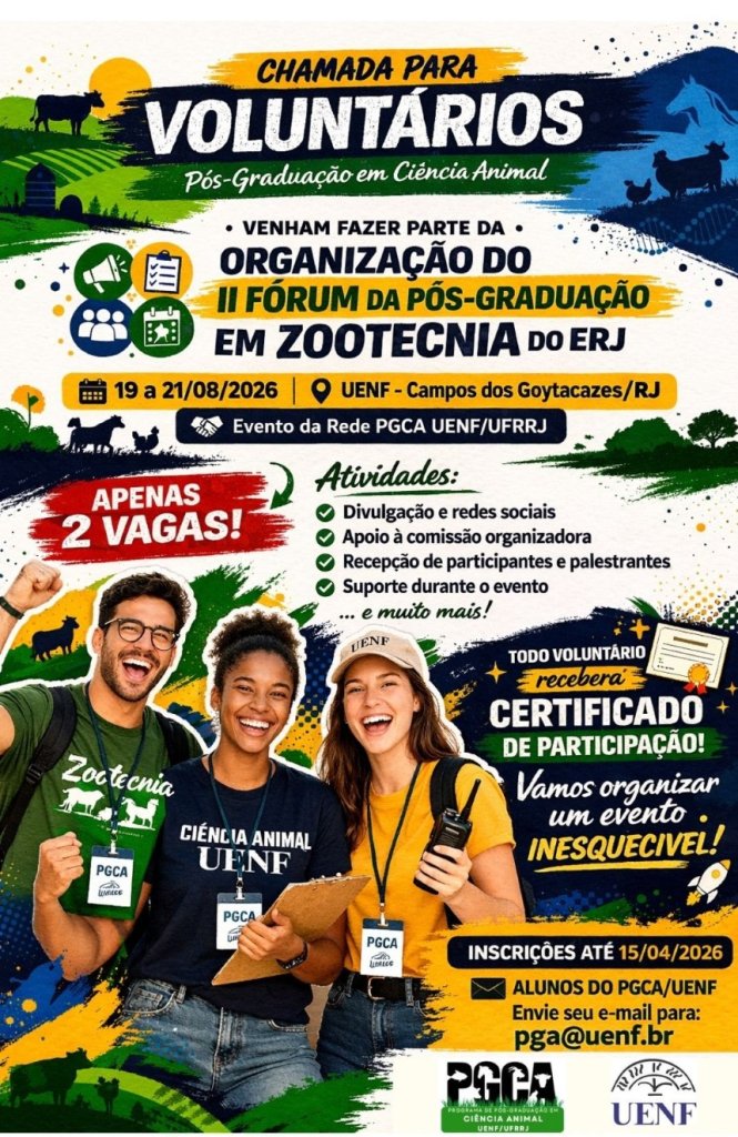 O PGCA/UENF convida alunos da pós-graduação em Ciência Animal para atuarem como voluntários na organização do II Fórum da Pós-Graduação em Zootecnia do Estado do Rio de Janeiro (ERJ), que será realizado de 19 a 21 de agosto de 2026, na UENF.