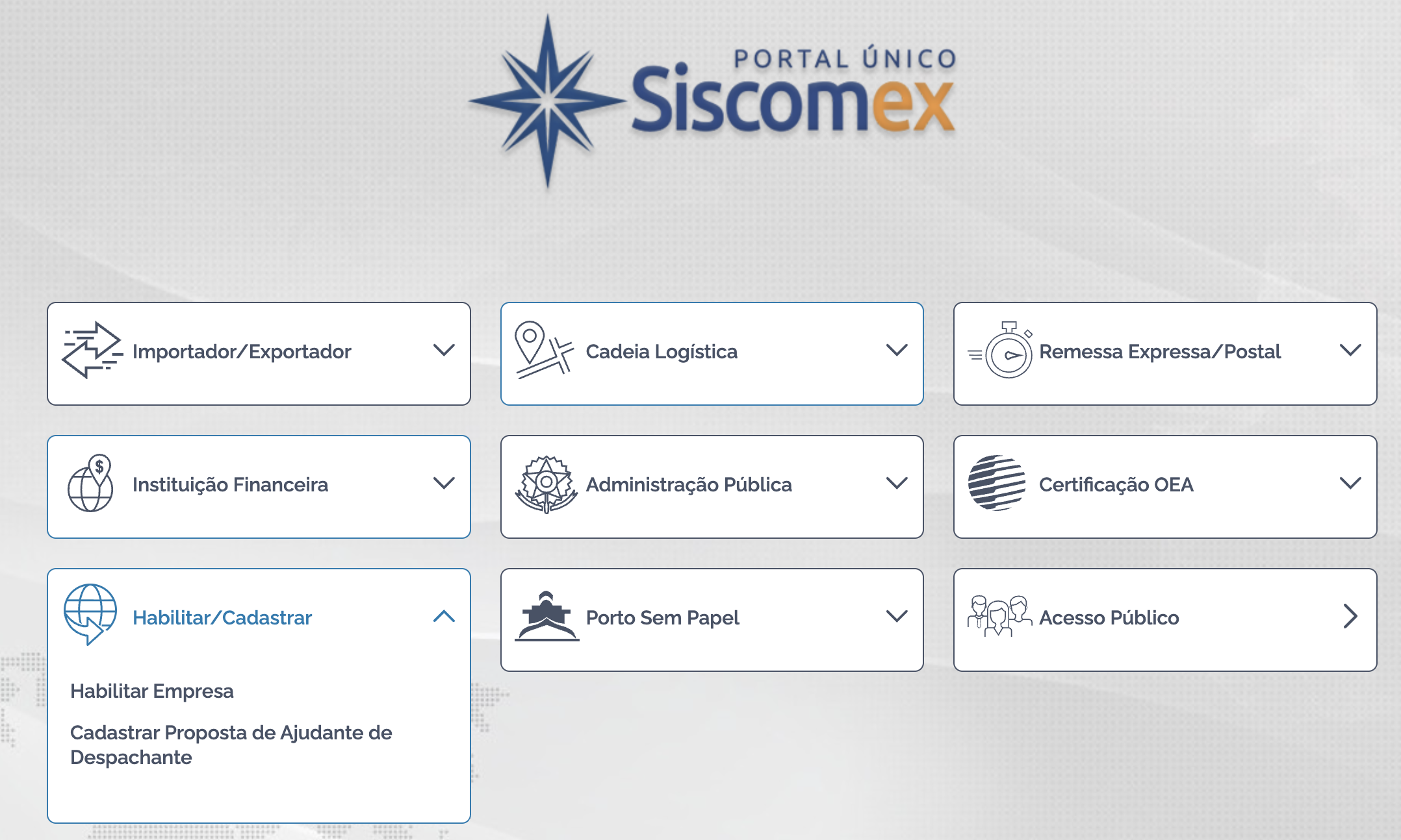 - Acesso: Acesse o Portal Único Siscomex e vá para o Sistema Habilita.