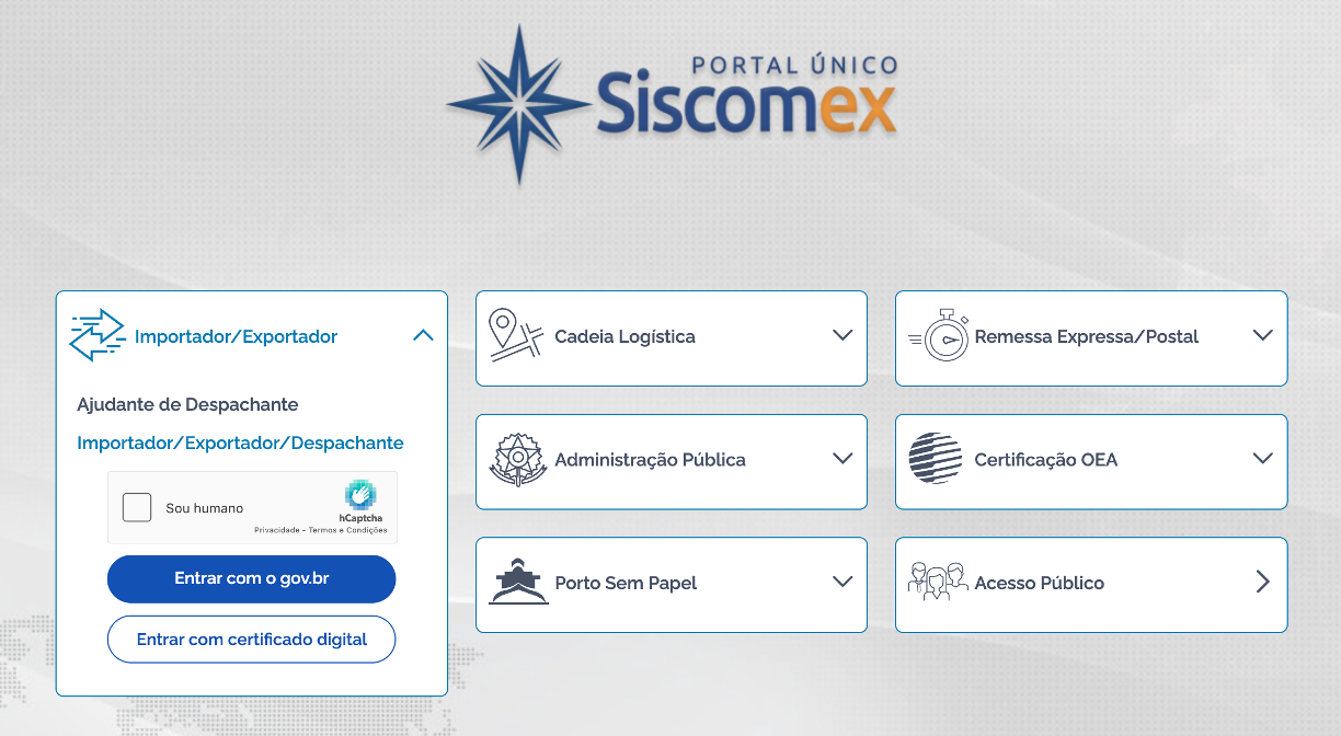 Acesse https://portalunico.siscomex.gov.br/portal/, na tela escolha a opção Importador/Exportador e depois a opção Importador/exportador/despachante.