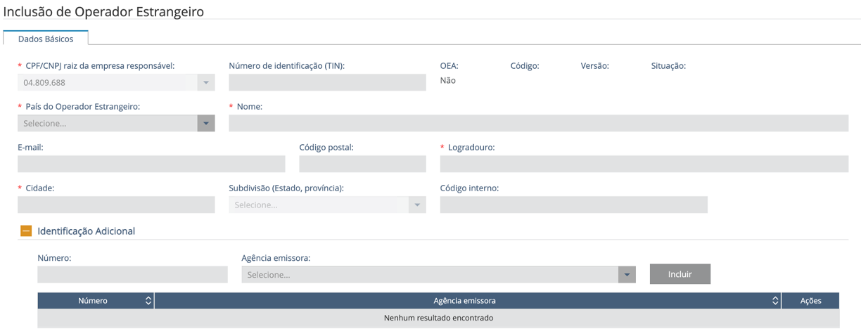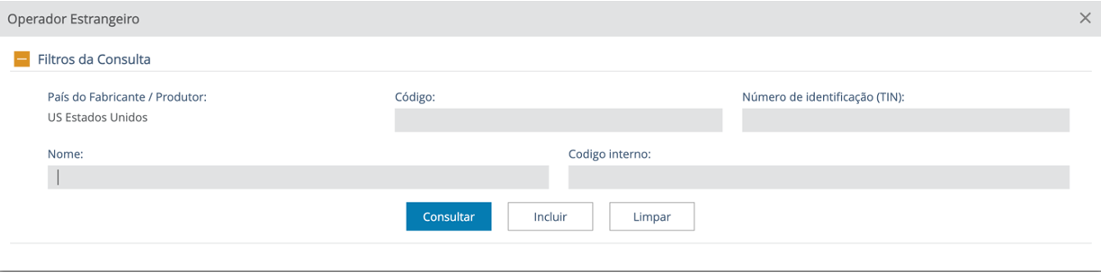 Preencha os campos obrigatórios (marcados com asterisco) incluindo CNPJ raiz do importador, país, número de identificação (TIN), nome do operador estrangeiro e clique em “Salvar”. Este operador será posteriormente vinculado aos produtos no catálogo.