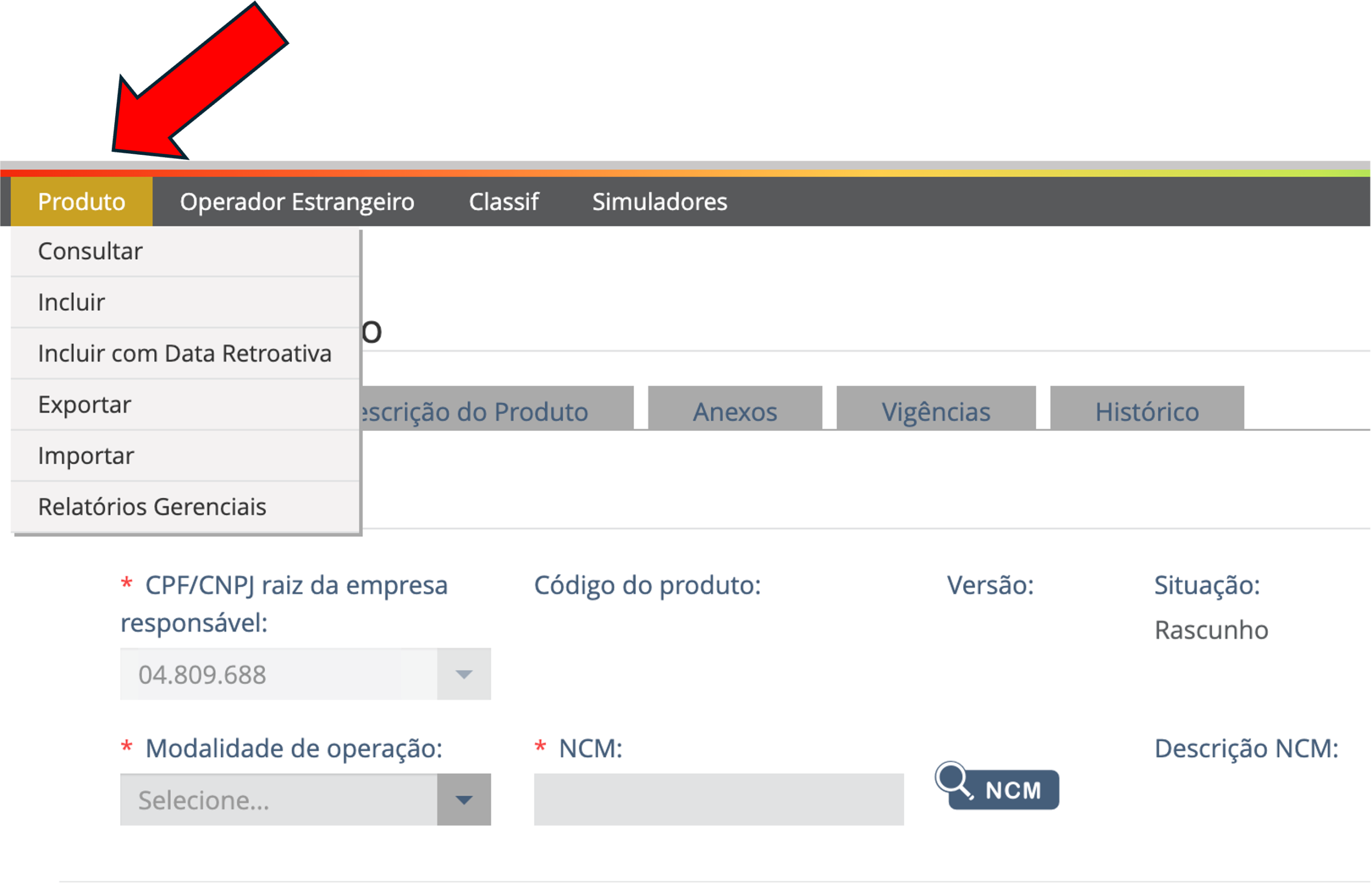 Acesse o Portal Único Siscomex utilizando sua conta GOV.BR ou seu certificado digital. Acesse a opção Catálogo de Produtos e navegue até Menu Produto > Incluir. Preencha os campos obrigatórios: CNPJ raiz do importador, NCM (normalmente sugerido na invoice mas você deve consultar na LUPA NCM e se certificar que o número sugerido é o correto. Modalidade de Operação = Importação.