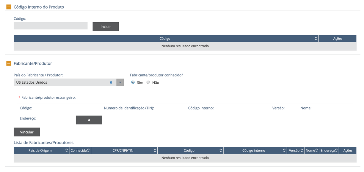 Se desejar preencha o Código Interno do Produto (código atribuído pelo importador para seu controle interno). Insira as informações sobre o fabricante/produtor (caso seja desconhecido veja a observação abaixo).