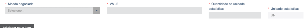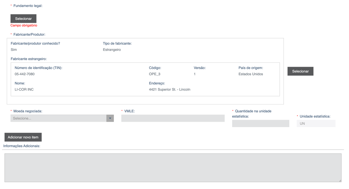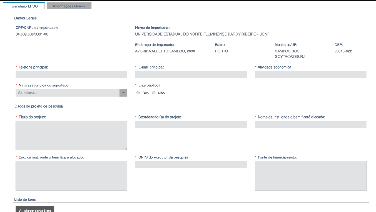 Escolha o item (ou itens) cadastrado(s) que serão vinculados a LPCO (o item deve ter sido salvo e ativado no respectivo modulo para que possa ser selecionado). Após adicionar o item será aberta nova aba para preenchimento.