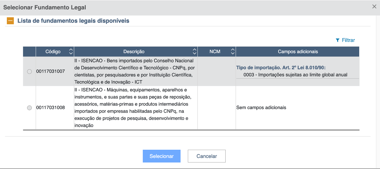 Fundamento Legal: Escolher o código 00117031007 (I – ISENCAO – Bens importados pelo Conselho Nacional de Desenvolvimento Científico e Tecnológico – CNPq, por cientistas, por pesquisadores e por Instituição Científica, Tecnológica e de Inovação – ICT)