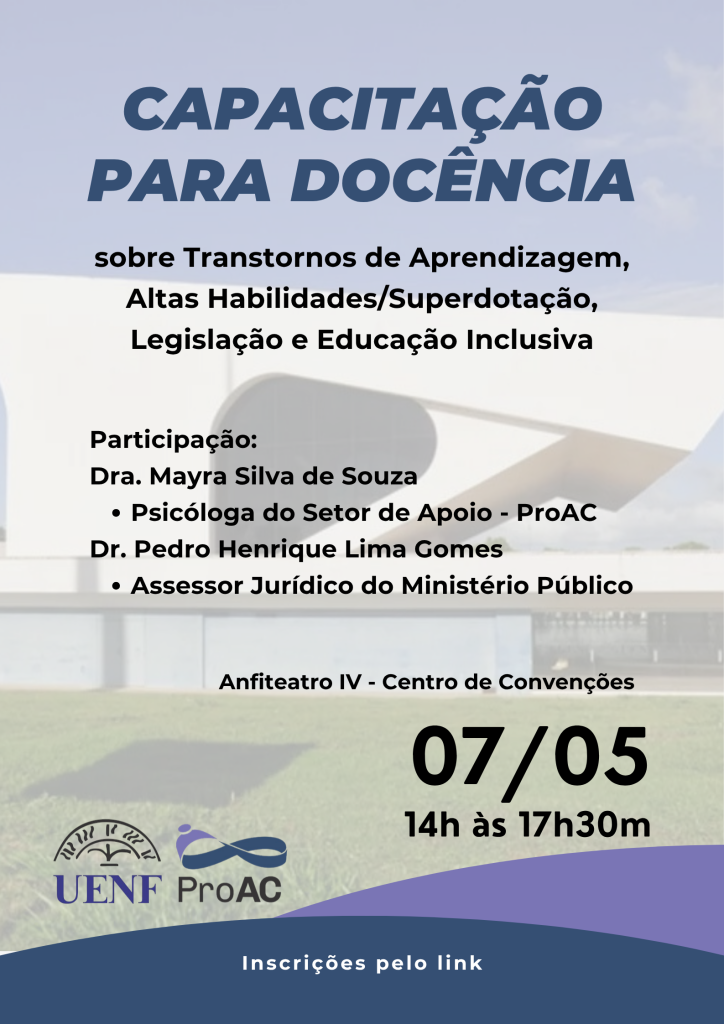 A Pró-Reitoria de Assuntos Comunitários (PROAC) dá continuidade às capacitações voltadas à docência em educação inclusiva com a promoção de mais um evento. Desta vez, com foco nos Transtornos de Aprendizagem, Altas Habilidades/Superdotação, Legislação e Educação Inclusiva.